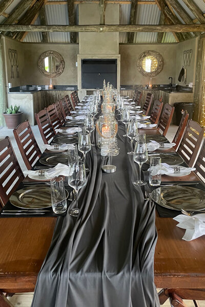 This setting also lends itself to private celebrations, galas and prestige events. A sit‑down layout can be arranged to suit your guest list, with tables opening onto the veranda and lawn overlooking the dam and fields beyond. The combination of indoor comfort and outdoor views makes it ideal for dinners, award ceremonies and milestone celebrations.